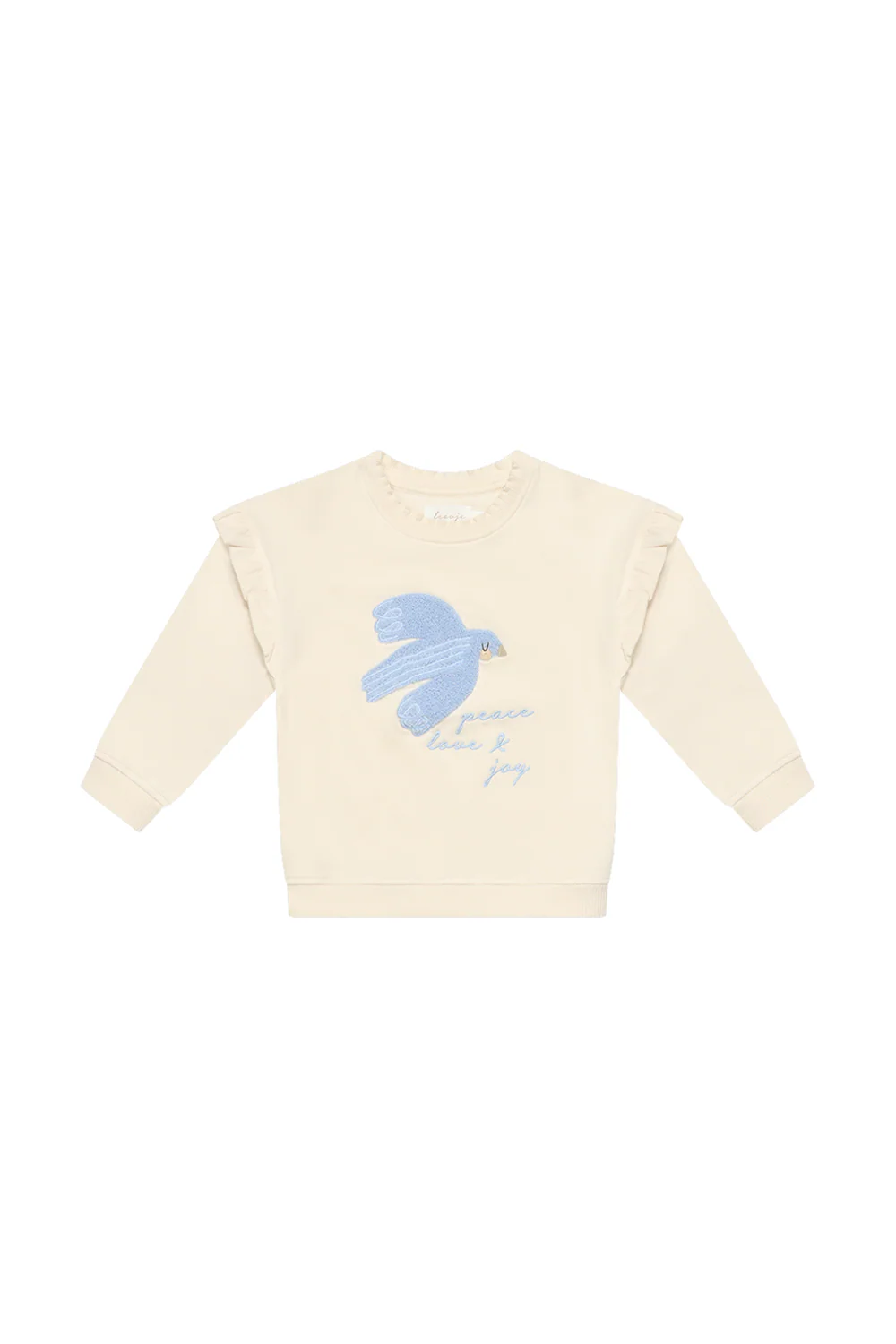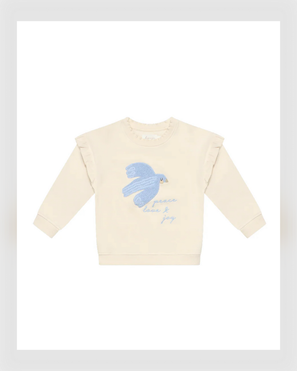Dieses kuschelige Sweatshirt aus weichem, innen angerautem Sweatstoff bietet höchsten Tragekomfort und ist perfekt für gemütliche Alltagslooks. In einem zarten Hellbeige gehalten, lässt es sich vielseitig kombinieren. Ein besonderer Hingucker ist der bunte Frotté-Schriftzug „peace, love & joy“ auf der Vorderseite – fröhlich, farbenfroh und mit liebevoller Botschaft. Der gerüschte Saum am unteren Abschluss verleiht dem Pullover eine verspielte Note und macht ihn zum Lieblingsstück im Kleiderschrank.