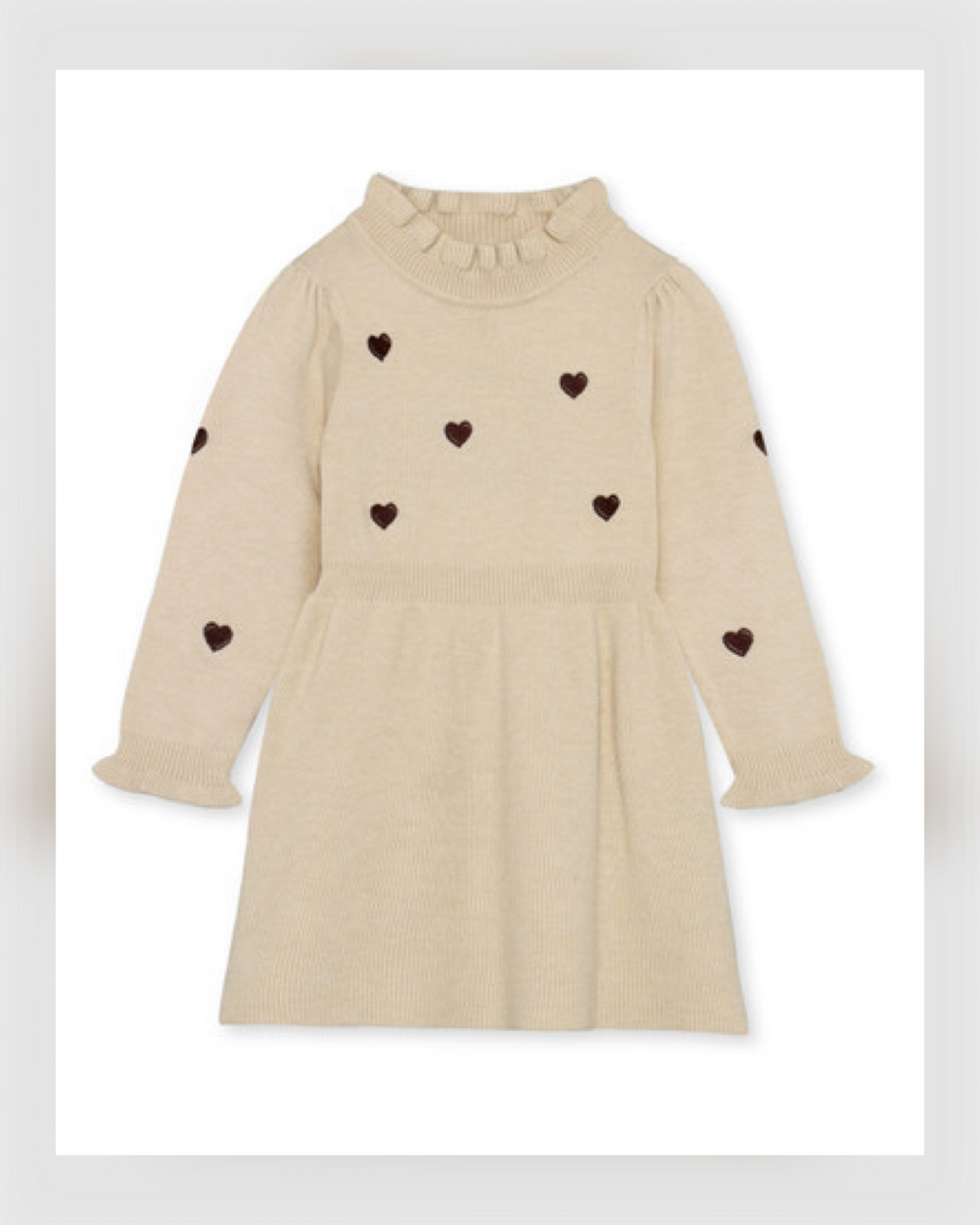 Fein gestricktes Kleid, verziert mit kleinen, kontrastierenden roten Herzen. Das Kleid hat lange Ärmel und Rüschen am Ausschnitt und an den Ärmelöffnungen.