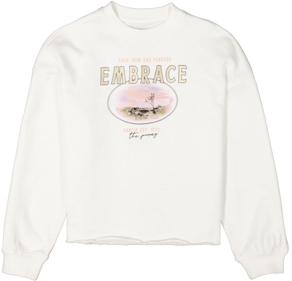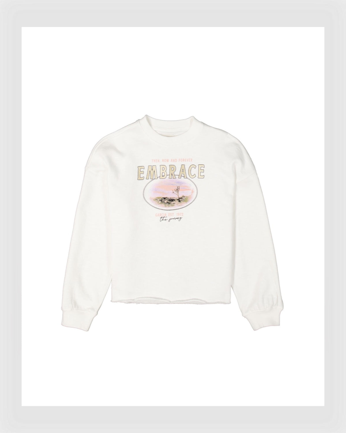 Lässig und bequem, das ist dieser Sweater. Cropped Sweater mit Foto- und Textprint. Der Sweater hat eine kastige Passform, lange Ärmel, einen runden Ausschnitt, eine abgeschnittene Unterkante und gerippte Bündchen an den Ärmelenden. Dieser Sweater ist aus 100% Baumwolle gefertigt.