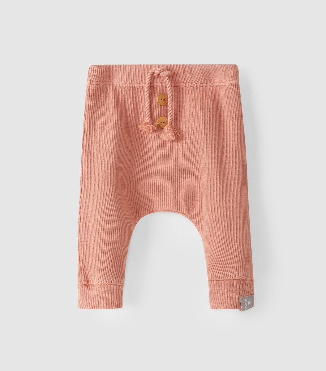Set of two pants in ribbed organic cotton. Wooden buttons and decorative drawstring. Elastic waistband for greater comfort.