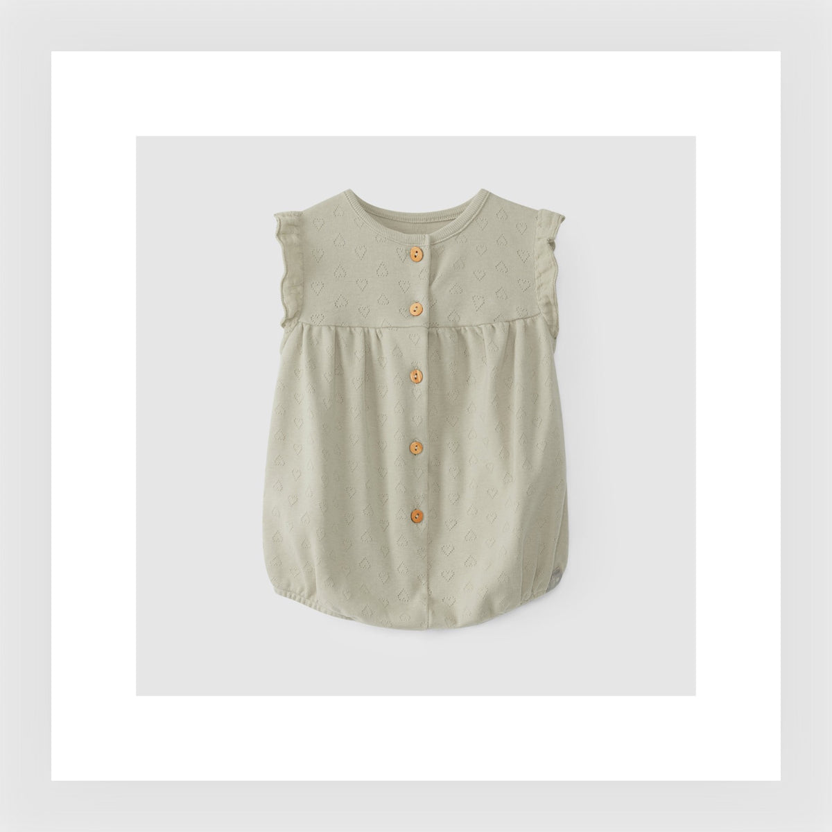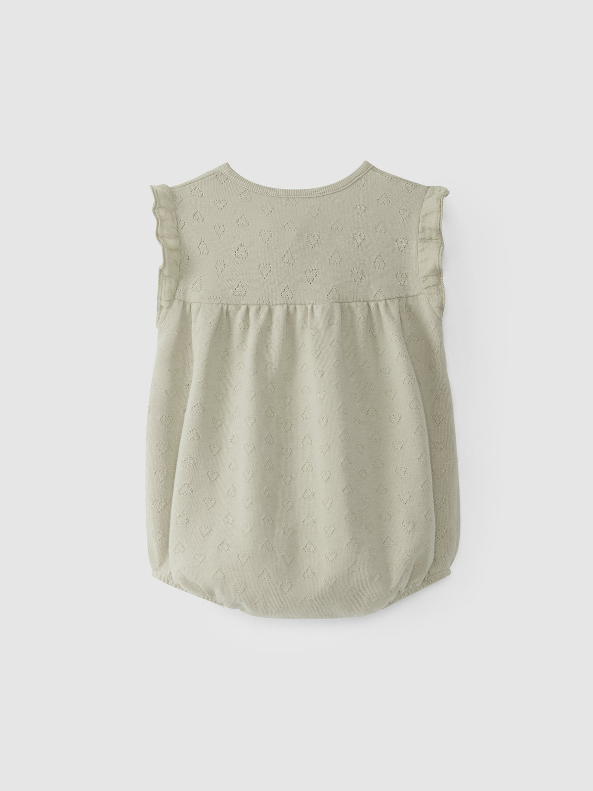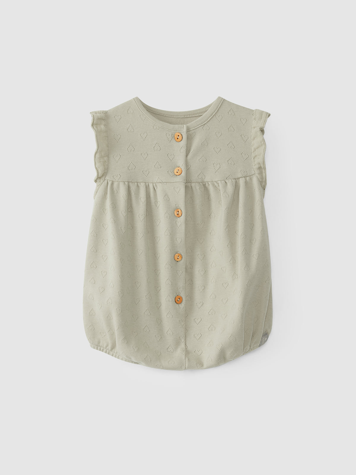 Bio-Baumwoll-Shortie mit Picot-Herzmuster und Rüschen an den Ärmeln. Befestigt mit Holzknöpfen an der Vorderseite und Poppers zwischen den Beinen.