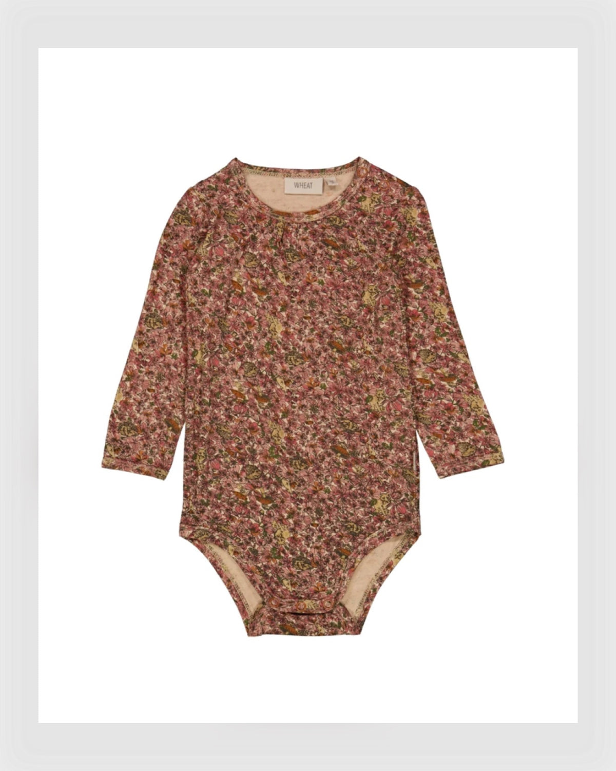Schöner Langarmbody hergestellt aus Viskose-Baumwollmix mit handgezeichneten Blumen bedruckt. Der Body hat Druckknöpfe an der Schulter und unten, welches das An- und Ausziehen erleichtert.